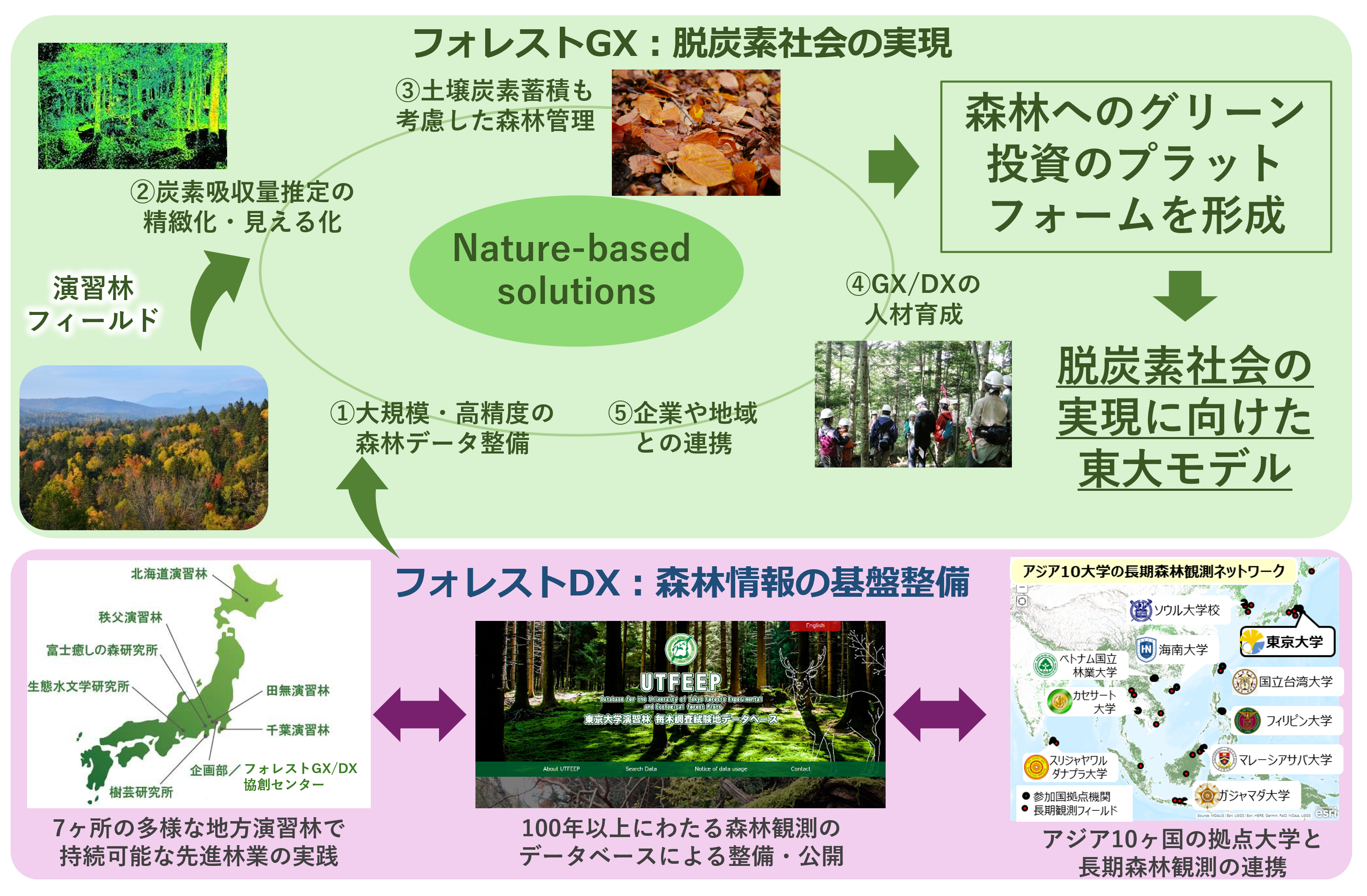 2024年4月1日に発足したFGDCは、皆様のご支援により順調にミッションを遂行しております。各部門のこれまでの成果や今後の活動については次頁以降をご覧いただくとして、ここでは、FGDCを取り巻く最近の森林GX/DXに関する動きについて簡単にご紹介します。国内外で森林への関心が日増しに高まっていることを感じるこの頃ですが、2024年10月に行われた北海道演習林125周年記念行事や2025年10月に行われた富士癒しの森研究所の100周年記念行事などにおいても、地域社会や行政、市民、また産業界からの森林への期待の大きさが再認識されたところです。国際的にも、演習林が培ってきたアジア各国の大学演習林との連携関係が、研究科レベルでの「生物多様性クレジットに関する連携協力協定」の締結へと発展し、2026年3月には研究科主催の国際シンポジウム「生物多様性へのアクションによるネイチャーポジティブ社会の実現」が開催されたところです。FGDCでも、これまで地方演習林レベルで締結されてきた地元自治体との連携協力協定にGXに関する内容を盛り込んで研究科レベルの協定にアップデートする作業を社会連携部門で進めているほか、2025年度からFGDCの徳永副センター長、李さん(URA)、五名さん(産学官連携コーディネータ)の3名が研究科の社会連携リエゾンオフィスを兼務して、研究科のGX/DX活動にも貢献しています。FGDCは,引き続き森林GX/DXの「東大モデル」の構築に向けて活動していきますので、今後とも皆様のご理解とご協力をお願いいたします。